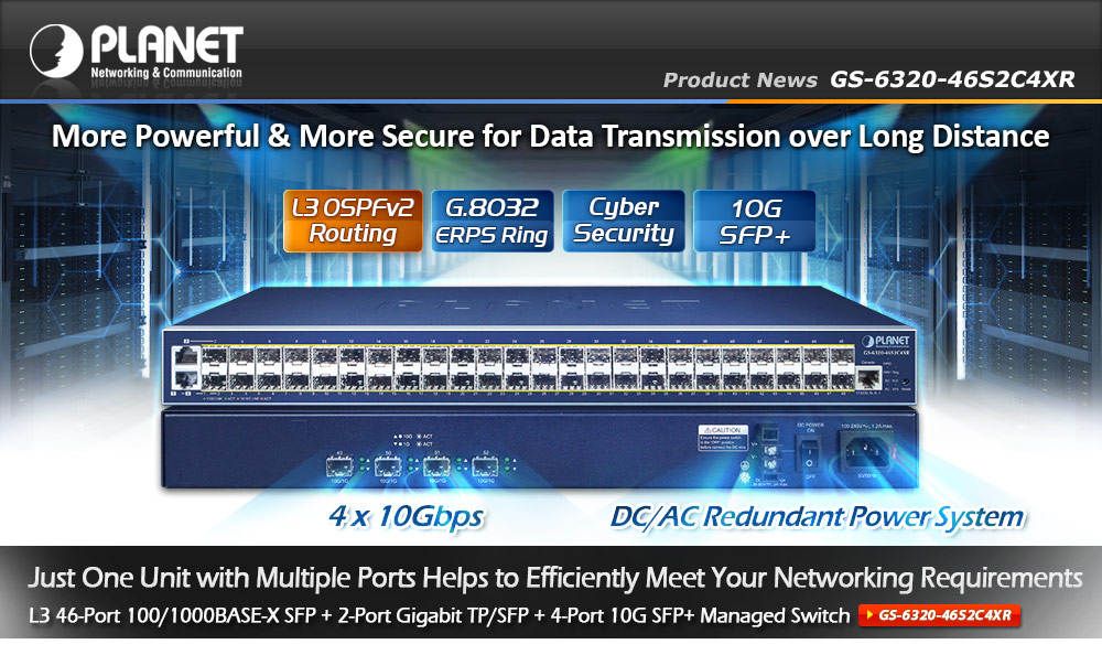 Начато производство высокопроизводительного коммутатора GS-6320-46S2C4XR , разработанного компанией Planet Technology. Оснащенный 48ю SFP-портами и четырьмя портами 10GBASE-LR/SR SFP+, коммутатор поддерживает статическую маршрутизацию между VLAN и протокол динамической маршрутизации OSPFv2. Производительность коммутационной матрицы GS-6320-46S2C4XR составляет 176 Гбит/с.