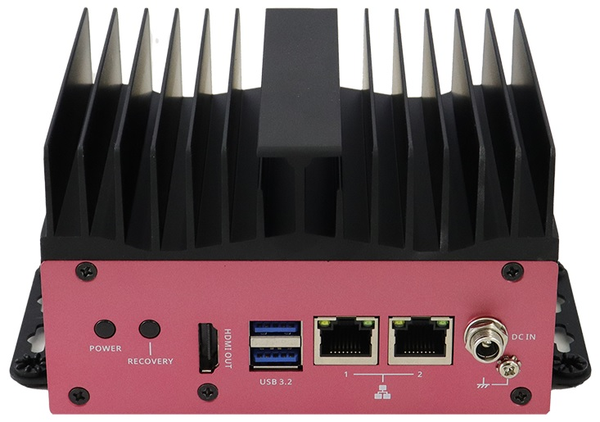 На передней панели компьютера расположены: два порта Gigabit Ethernet (1000BaseT), два гнезда шины USB 3.2, видеоинтерфейс HDMI, кнопка включения, ввод питания. На боковой поверхности корпуса находится еще один ввод питания и универсальный разъем с 4 GPIO, 2 UART, 1 CAN и 2 I2C. На задней панели два отверстия для монтажа антенного гнезда.