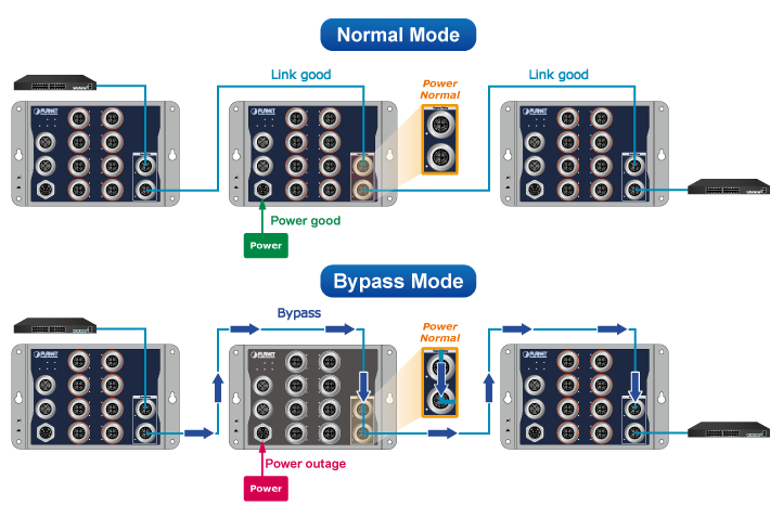 В обычном режиме работы гнезда портов с Bypass работают как обычные порты коммутатора. Но если коммутатор будет полностью обесточен, реле коммутирует эти гнезда, соединяя подключенные к нему устройства одним сегментом. Данная функция может быть полезна при совместной работе нескольких коммутаторов, повышая устойчивость всей системы.