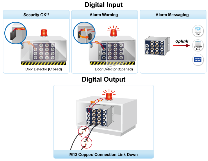 У ITS-5216-8P2TB-WV есть дискретный интерфейс с одним каналом ввода и одним каналом вывода. При изменении состояния входа внутреннее ПО коммутатора может создавать оповещение или управлять состоянием выхода, подавая сигнал персоналу или внешнему устройству.