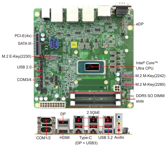 На панель внешних разъемов платы выведены: два COM-порта RS/232/422/485, видеовыходы HDMI и DP, три порта 2.5GBASE-T, 6 гнезд шины USB 3.2, аудиоразъемы. Плата может работать с 4 независимыми дисплеями, два разъема USB Type-C позволяют подключать дисплей DP. К внутренним коннекторам подключаются 4 гнезда USB 2.0, два порта RS-232, дисплей eDP, 4-битный интерфейс дискретного ввода-вывода.