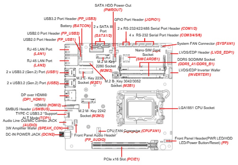 На внешние разъемы платы выведены два 2.5-гигабитных порта Ethernet, 5 гнезд шины USB 3.2, видеоинтерфейвы HDMI и DP, аудиовыход, разъем питания платы. К внутренним коннекторам подключаются 4 гнезда шины USB 2.0, 2 гнезда USB 3.2, 8 бит GPIO, 4 порта RS-232, 2 порта RS-232/422/485, дисплей LVDS, панель HD AUDIO, динамики.