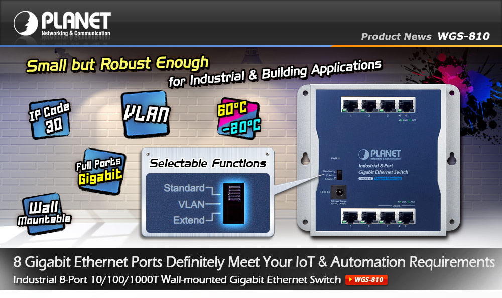 В выпускаемой корпорацией PLANET Technology линейке Gigabit Ethernet Switch появилась новая модель промышленного коммутатора. Настенный коммутатор WGS-810 оснащен восемью портами 10/100/1000BASE-T и предназначен для решений в сфере промышленной автоматизации и автоматизации здания.