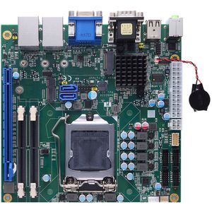 На плату устанавливаются процессоры семейства Comet Lake с максимальным теплопакетом 65 Вт, что позволяет плате работать большинством таких процессоров, включая восьмиядерный Core i7-10700 и десятиядерный Core i9-10900. Старшим процессорам семейства для работы требуется память DDR4-2933, а процессорам Core i5 и ниже - DDR4-2666. Используется память в конструктиве SODIMM, два модуля максимальным общим объемом 128 Гб. Обслуживанием шины PCI Express и контролем периферийных устройств занимается PCH Intel H410. Для подключения дисковых накопителей служат два порта SATA3 и слот M.2 3052 B-key. Для установки плат расширения служат слоты: PCI Express x16, Mini PCIe, M.2 2230 E-key.