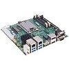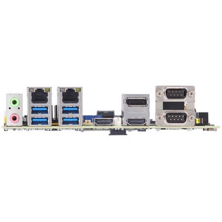На панели внешних разъемов выведены: 2 COM-порта RS-232/422/485, видеовыходы HDMI и DP, 2 порта 2.5GBASE-T, 4 гнезда шины USB 3.2, аудиоразъемы. К внутренним коннекторам подключаются 4 гнезда шины USB 2.0, видеовыход eDP и два порта RS-232/422/485. Как это нередко бывает с компактными платами, отсека для литиевого элемента питания CMOS на самой MANO566 нет, он подключается кабелем.
