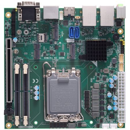 У платы стандартная компоновка внешних разъемов и ее можно размещать в корпусах стандартной высоты и в "толстых" панельных компьютерах. Процессор устанавливается в стандартный сокет LGA 1700. Крепежные отверстия для кулера стандартные, а для питания систем охлаждения процессора и корпуса имеются два коннектора 4 pin PWM. Процессору потребуется оперативная память DDR4-3200, два SODIMM максимальным общим объемом 64 Гб. В качестве дисковых накопителей может использоваться M.2 SSD (слот 2280 Key M) и два SATA-устройства. Модификации MANO566-Q670E и MANO566-R680E поддерживают RAID 0/1 на базе PCH. Платы расширения устанавливаются в слот 1 PCIe x16, M.2 2230 Key E, M.2 3042/3052 Key B.