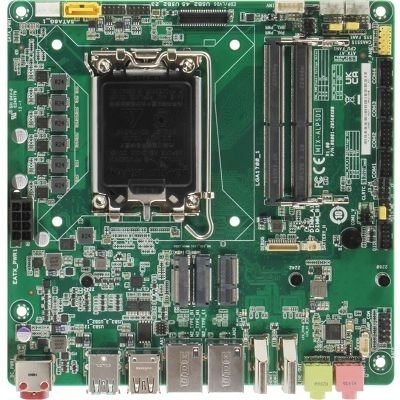Intel Core 12 поколения, H610E, 2 DDR5 SODIMM, 2 HDMI, 2 DP, 4 LAN, 8 USB, 6 COM, M.2 (E2230, M2280, B3052), 2 отсека 2.5'' SATA, питание 12~24 V DC, -20~50 C