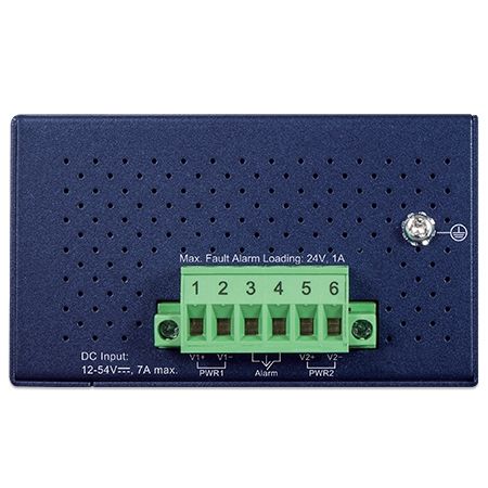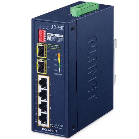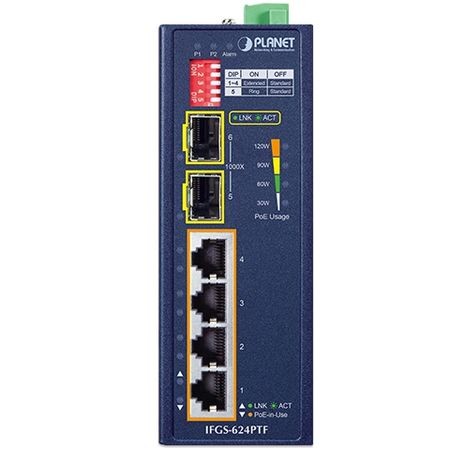 Промышленный коммутатор IFGS-624PTF, 4 x 10/100BASE-TX с 802.3at PoE, 2 x 1000BASE-X SFP, бюджет PoE 120 Вт, установка на DIN-рейку, резервированное питание 12~54 V DC, -40~75C, IP40